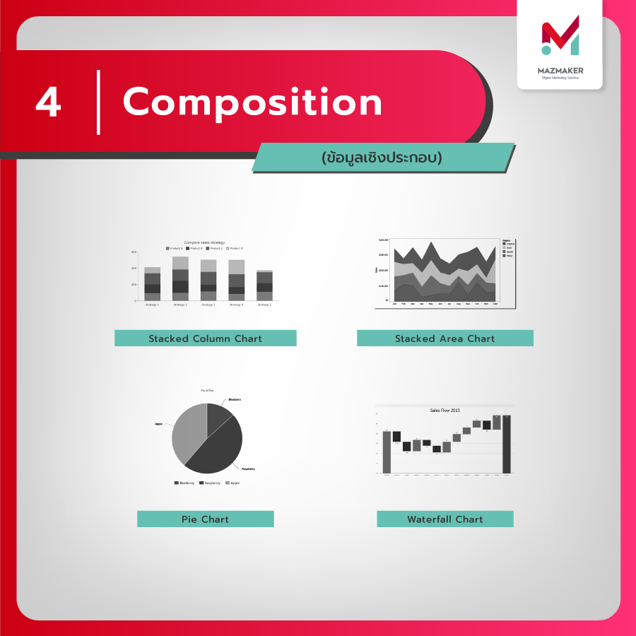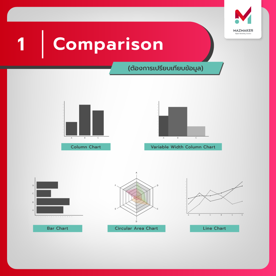 โดยรูปแบบของกราฟนั้นมีอยู่หลากหลายประเภท แล้วข้อมูลแบบไหนเหมาะกับกราฟแบบไหนล่ะ? วันนี้ [tooltip hint=”ที่ปรึกษาการตลาดออนไลน์ เชียงใหม่”]Mazmaker[/tooltip] ได้รวบรวมเทคนิคการแสดงผลข้อมูลให้อ่านได้ง่ายขึ้นมาฝากครับ